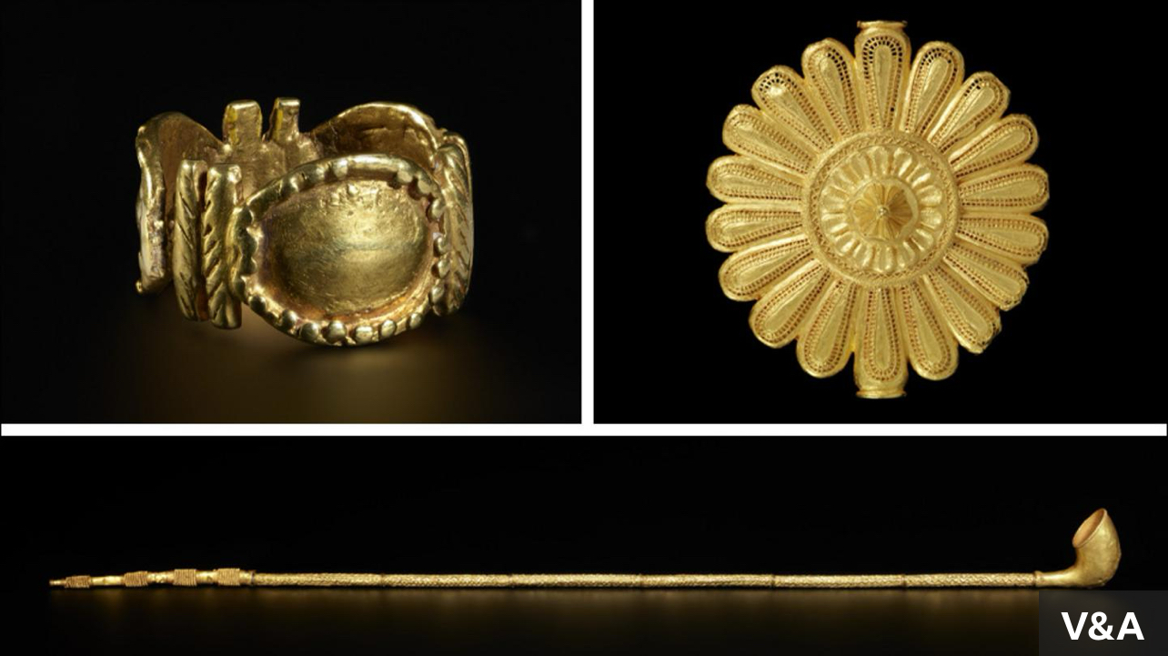 Those from the V&A Museum include 1 gold peace pipe, 3 cast gold soul-washers’ badges, 7 sections of sheet-gold ornament, 1 silver straining spoon, 1 pair of silver anklets, 1 section of sheet-gold ornament and 1 cast gold soul-washer’s badge.