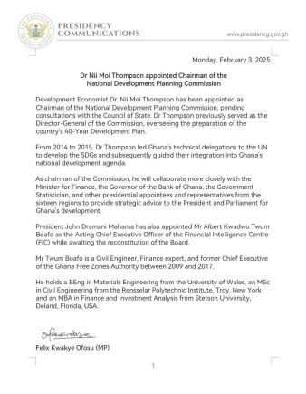 In a statement issued on February 3, the Acting Spokesperson to the President, Felix Kwakye Ofosu, announced the appointment, highlighting Dr Thompson’s previous tenure as Director-General of the Commission, where he played a key role in drafting Ghana’s 40-Year Development Plan.