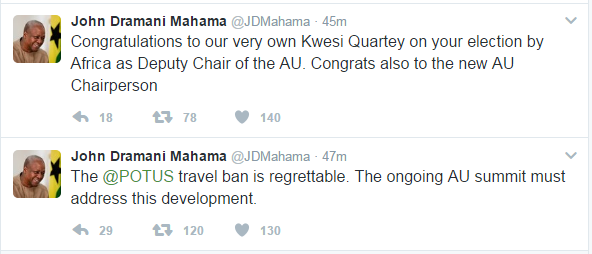 The immediate-past Chairman of ECOWAS tweeted: "The @POTUS travel ban is regrettable. The ongoing AU summit must address this development".