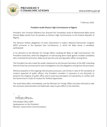 President John Dramani Mahama has directed the immediate recall of Mohammed Baba Jamal Ahmed from his post as Ghana’s High Commissioner to Nigeria following allegations of voter inducement during the National Democratic Congress Ayawaso East parliamentary primary on Saturday.