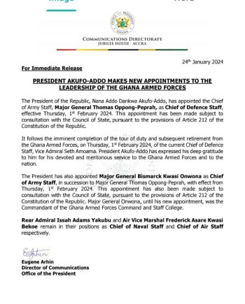 The President has also appointed Major General Bismarck Kwasi Onwona as Chief of Army Staff, in succession to Major General Thomas Oppong-Peprah, with effect from Thursday, 1st February 2024.