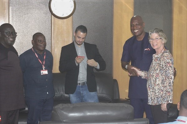 Mr Ato Afful (2nd-right) ) welcoming Ms Lin Larsen (right) to his office. With them are an official of ROXCEL and some officials of GCGL