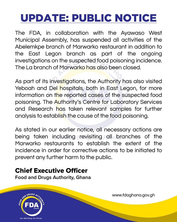 "The La branch of Marwarko has also been closed. As part of its investigations, the Authority has also visited Yeboah and Del hospitals, both in East Legon, for more information on the reported cases of the suspected food poisoning.