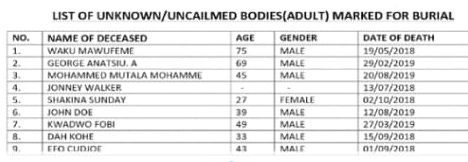 The Hospital in a public notice published in the Daily Graphic said the bodies which have been in its mortuary for over nine months will be buried if they remain unclaimed three weeks after the announcement.
