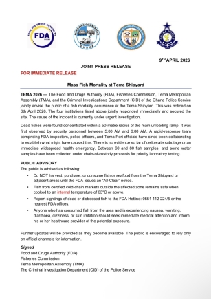 Authorities have issued a public advisory urging citizens to refrain from harvesting, purchasing or consuming any fish or seafood from the Tema Shipyard or nearby areas until the FDA issues an “All-Clear” notice.