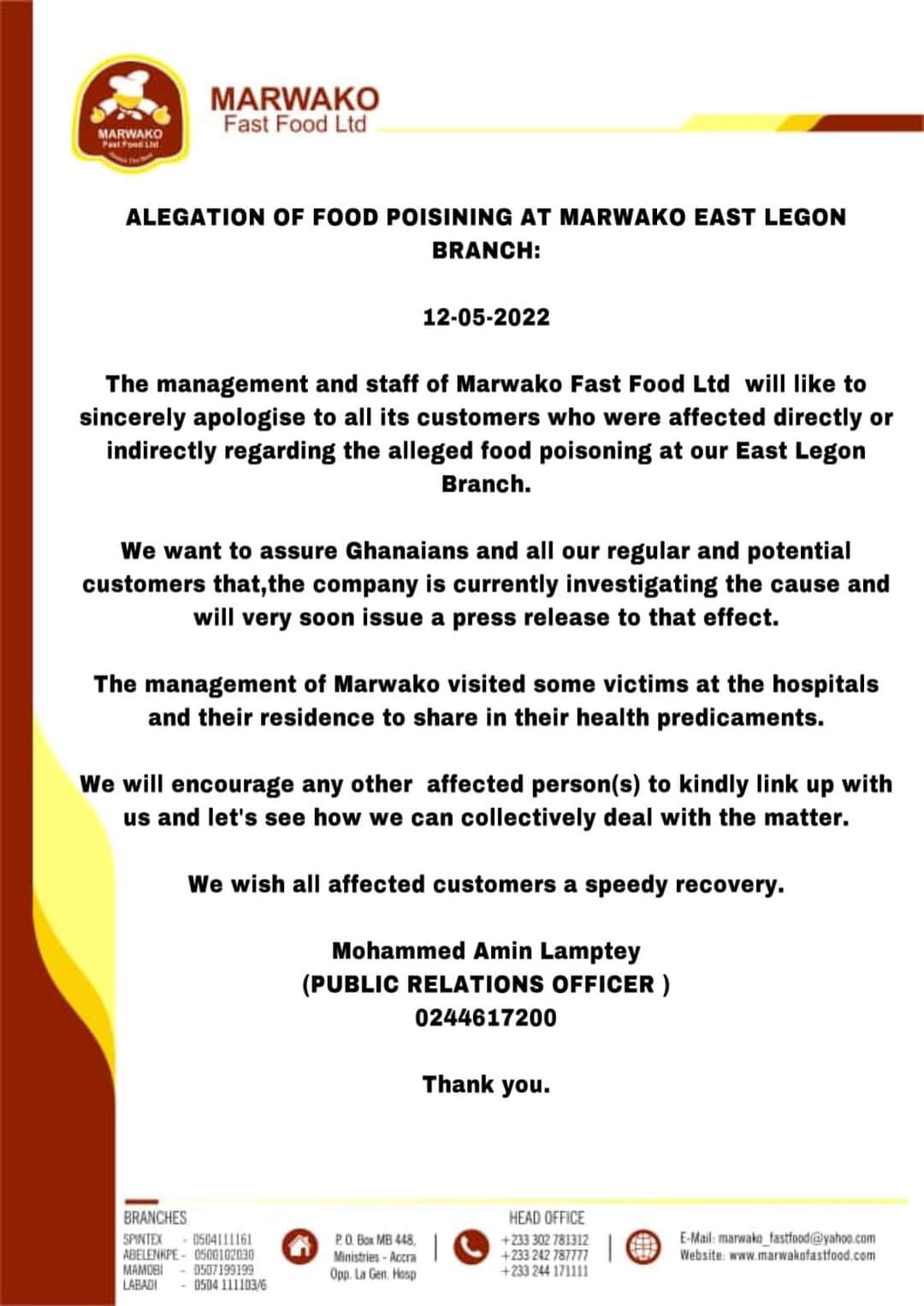 The management of Marwako have since taken taken up the medical bills of 53 customers allegedly affected by the said food poisoning.
