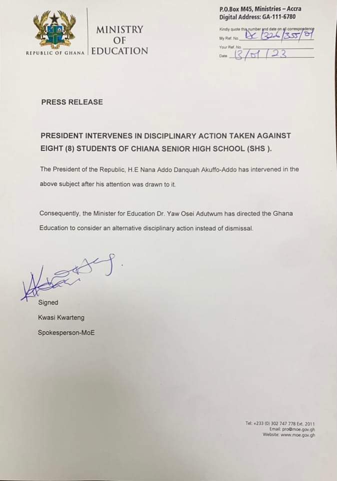 President Nana Addo Dankwa Akufo-Addo has intervened in the case of the eight senior high school students of Chiana who have been dismissed by the Ghana Education Service (GES) for insulting the President.
