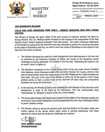 The Ministry of Energy has clarified remarks made by Dr. Matthew Opoku Prempeh, the Energy Minister, regarding public calls for a load-shedding timetable amid ongoing power outages.