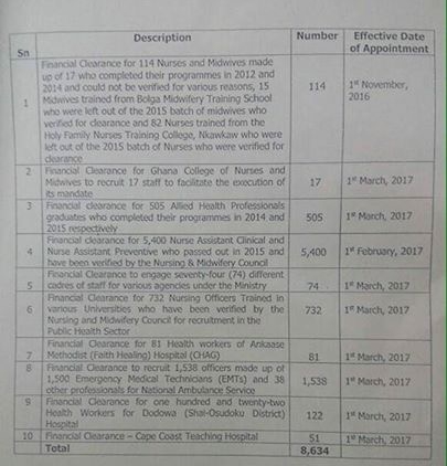 The Finance Ministry however noted that “the above number of 8,634 should be deducted from their [Health Ministry’s] 2017 quota for recruitment and replacement.”