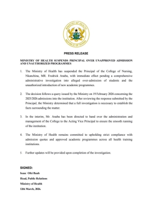 According to a press release dated March 12, the Ministry issued a query to Mr Anaba on February 19, concerning the 2025/2026 admissions process. After reviewing his response, the Ministry determined that a full investigation was necessary to establish the facts.