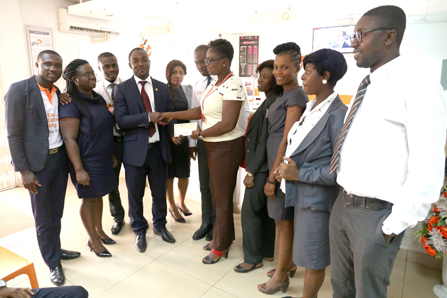 Mr Eric Offei Darko, Fidelity bank, Mamprobi branch, donating a cheque to Ms Yvonne Aryee, Corporate Communications Officer, GCGL