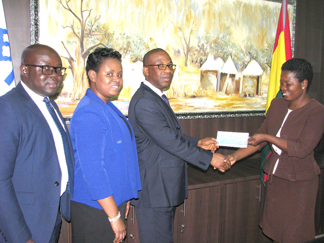Mr Benjamin Dzoboku (3rd left), General Manager of Finance and Strategy of HFC Bank, presenting a cheque to Ms Mavis Kyerewaa Boateng (right)