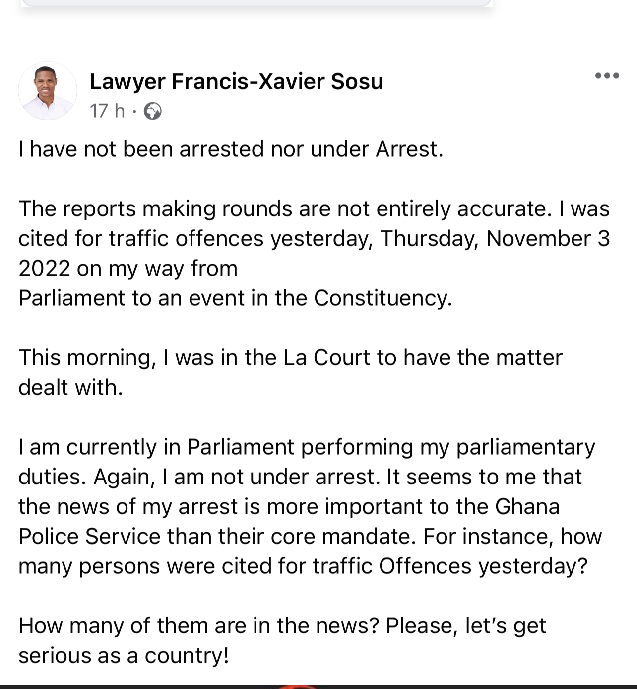 “I am currently in Parliament performing my parliamentary duties. Again, I am not under arrest. It seems to me that the news of my arrest is more important to the Ghana Police Service than their core mandate. For instance, how many persons were cited for traffic Offences yesterday?