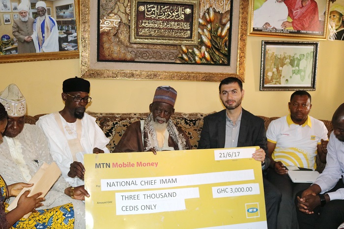 MTN Ghana on Wednesday donated Gh₵3,000 and some assorted items to the National Chief Imam, Dr. Sheikh Usumanu Nuhu Sharabutu, towards the celebration of this year’s Eidul Fitr.