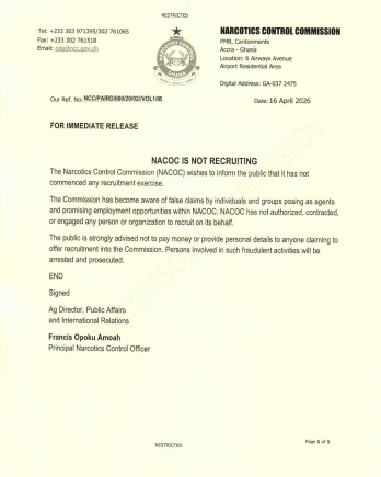 In a press release by the Acting Director of Public Affairs, Francis Opoku Amoah, NACOC stated that it has not authorised, contracted, or engaged any person or organisation to recruit on its behalf.