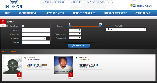 There are currently only two Ghanaians on the INTERPOL list of wanted persons; 41-year-old Fuachie Alex Kwame and Alangdi Asagbeke, 42.
