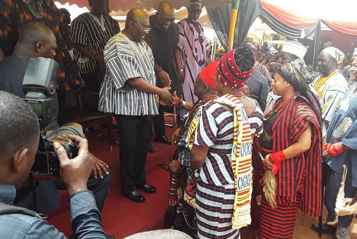 Dr. Bawumia , (left), Vice President being welcome by Naa Dr. Enerst Sangson-Tulong I, ( in red hat partly covered) , Gengenkpe-Naa to the funeral grounds