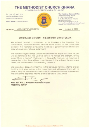 Augustina Tawiah reports that the Methodist Church Ghana has expressed its condolences to President John Dramani Mahama, the government, and the people of Ghana. In a statement signed by the Presiding Bishop, Most Rev. Prof. Johnson Kwabena Asamoah-Gyadu, the church described the incident as a national tragedy that should inspire reflection and unity.