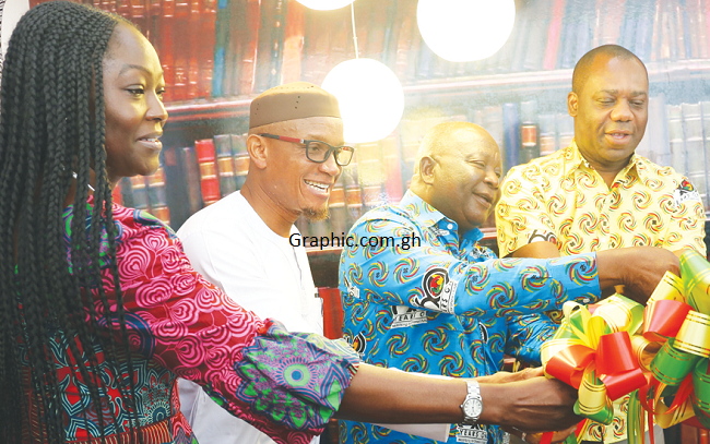 Mr Matthew Opoku Prempeh (right), cutting the tape to launch the e-Library Project. Looking on are Mrs Valentina Mintah (left), Mr Mustapha Abdul-Hamid (2nd left), Minister of Information and Mr Ken Amankwah (2nd right), Chairman, Ghana 60 years on Committee. Pictures: SAMUEL TEI ADANO