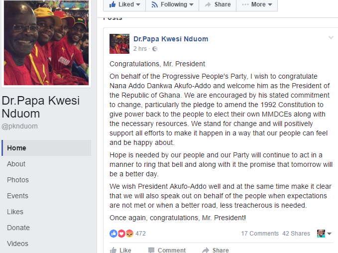 On his facebook page, Dr Nduom stated, “On behalf of the Progressive People's Party, I wish to congratulate Nana Addo Dankwa Akufo-Addo and welcome him as the President of the Republic of Ghana”.