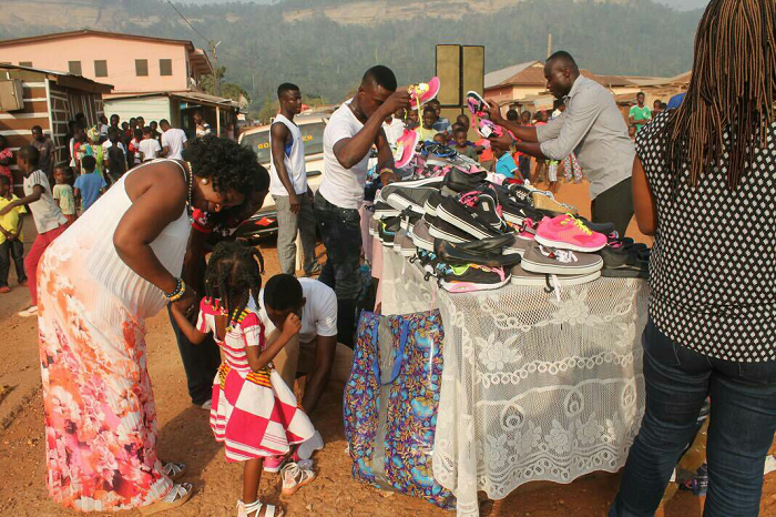 Ms Jennifer Appiah helping a girl to wear one of the shoes