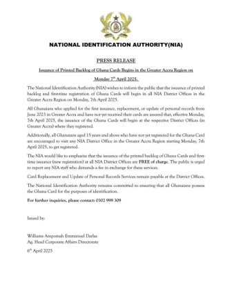 “All Ghanaians who applied for the first issuance, replacement, or update of personal records from June 2023 in Greater Accra and have not yet received their cards are assured that, effective Monday, 7th April 2025, the issuance of the Ghana Cards will begin at the respective District Offices where they registered,” the statement read.