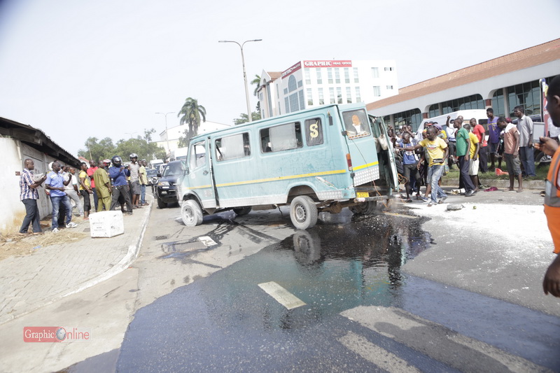 The bus, which was heading towards Ablekuma-Nsakena from the CMB Market in Accra, was heavily damaged.