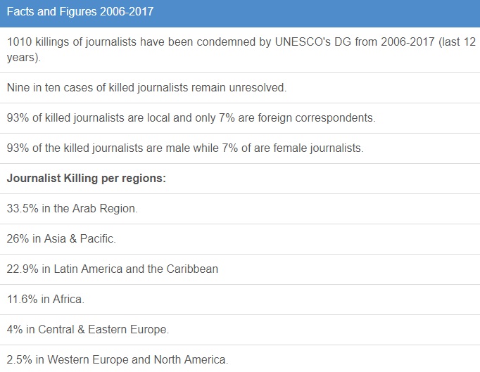 "Journalists worldwide in the exercise of their profession have become the targets of assassination by those who abhor open transparent democracies. Unesco is committed to defending the safety of journalists and fighting against impunity following crimes committed against them".