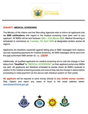 The Ministry of the Interior has issued a warning to all prospective applicants, urging them to disregard any text message related to the upcoming medical screening phase unless it bears the official sender ID “CSERP.”