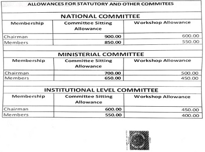 The Chairperson and members of Ministerial Committees are due GH₵700 and GH₵650 as sitting allowances and GH₵500 and GH₵450 as respective workshop allowances.
