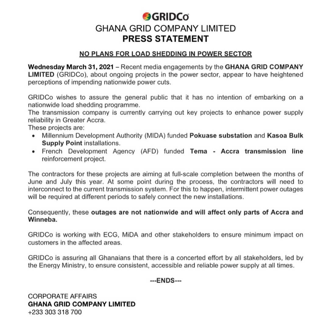 "GRIDCO wishes to assure the general public that it has no intention of embarking on a nationwide load shedding programme. The transmission company is currently carrying out key projects to enhance power supply reliability in Greater Accra".
