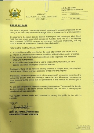 The Ashanti Regional Security Council (REGSEC) has announced a ban on motorbikes after 7:00 pm and suspended an inter-tribal football competition following the fatal shooting of Alhaji Abdul-Malik Azenbge, Chief of Kusaase, in Asewase on Tuesday, July 22, 2025.
