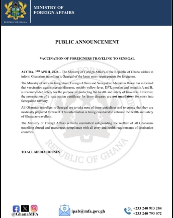 The Ministry of Foreign Affairs has advised Ghanaian travellers to Senegal that vaccinations against yellow fever, DPT, measles, and hepatitis A and B are recommended but no longer mandatory for entry into the country.
