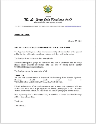 The family of the late former First Lady, Nana Konadu Agyeman-Rawlings, has announced that condolence visits will be received only on weekdays until further notice.