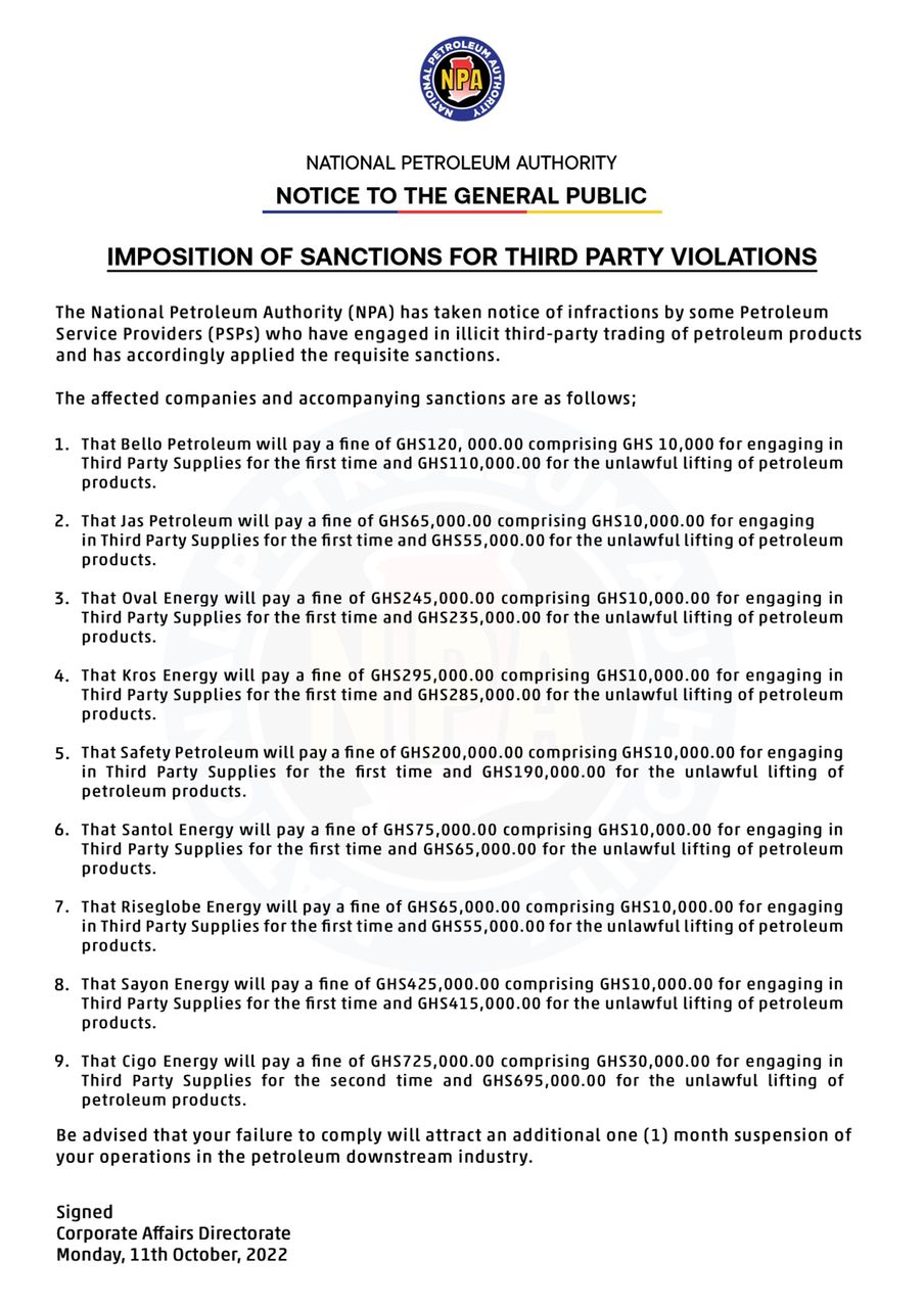In a statement, the NPA said it had directed Cigo Energy to pay a fine of GH¢725,000 comprising GH¢30,000 for engaging in third party supplies for the second time, and GH¢695,000 for the unlawful lifting of petroleum products.”