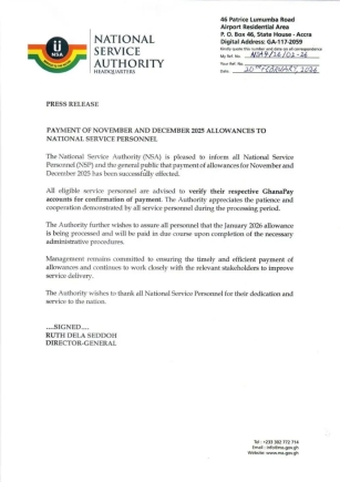 The National Service Authority (NSA) has announced the successful payment of allowances to all eligible National Service Personnel (NSP) for the months of November and December 2025.