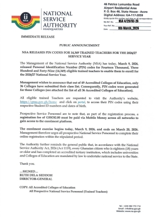 The National Service Authority (NSA) has released Personal Identification Number (PIN) codes for 14,349 trained teachers to enable them to enrol for the 2026/2027 national service year.