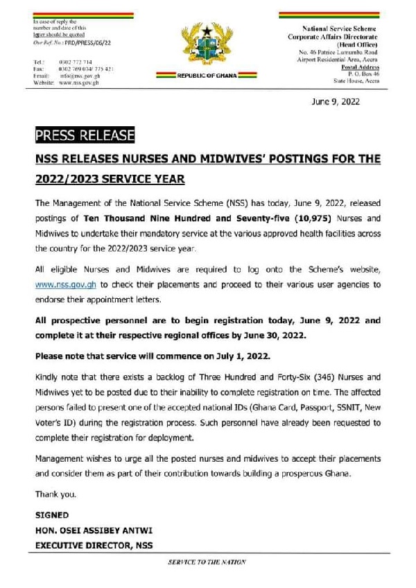 A statement signed by the Executive Director, Hon. Osei Assibey Antwi on Thursday, June 9, 2022, said “The Management of the National Service Scheme (NSS) has released postings of ten thousand, nine hundred and seventy-five (10,975) nurses and midwives to undertake their mandatory service at the various health facilities across the country for the 2022/2023 service year".