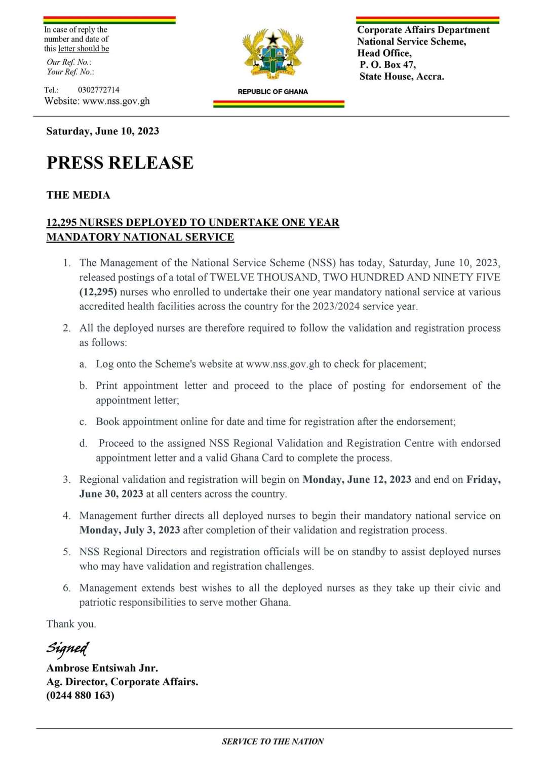 The NSS Management has directed all deployed nurses to commence their service on Monday, July 3, 2023, immediately after the validation and registration process. In case any nurses encounter challenges during validation and registration, NSS Regional Directors and registration officials will be available to provide assistance and support.