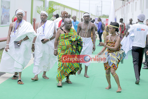 Nii Bortey Klan I, Klagon Mantse, and his traditional priests being ushered out of the premises with a dance after the inauguration