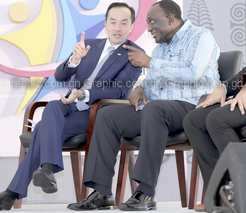 Mr Alan Kyerematen (left), the Minister of Trade, and Dr Koh Poh Koon, the Minister of State for Trade and Industry of Singapore, unveiling a plaque to inaugurate the project