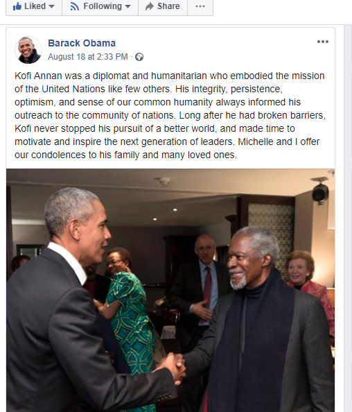 In a post on his Facebook, Mr Obama said: “Kofi Annan was a diplomat and humanitarian who embodied the mission of the United Nations like few others.”
