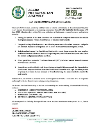 The Accra Metropolitan Assembly (AMA) has announced that this year’s ban on drumming and noise-making will be in effect from Monday, May 12, to Thursday, June 12, 2025, as part of preparations for the annual Homowo Festival celebrated by the Ga people.