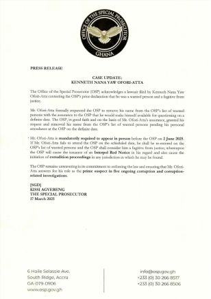 “Mr Ofori-Atta is mandatorily required to appear in person before the OSP on 2 June 2025. If Mr Ofori-Atta fails to attend the OSP on the scheduled date, he shall be re-entered on the OSP’s list of wanted persons and the OSP shall consider him a fugitive from justice; whereupon the OSP will cause the issuance of an Interpol Red Notice in his regard and also cause the initiation of extradition proceedings in any jurisdiction in which he may be found,” the OSP statement warned.