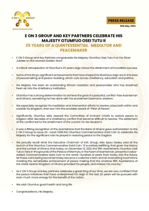 - E ON 3 Group and Key Partners congratulate His Majesty Otumfuo Osei Tutu II on his Silver Jubilee on the revered Golden Stool.