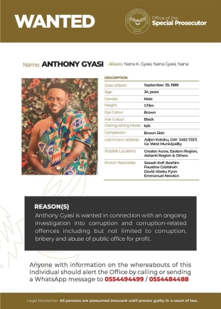 Gyasi's last known address is in Adjen Kotoku, Ga West Municipality, with possible locations in Greater Accra, the Eastern Region, and the Ashanti Region. He is associated with individuals such as Sessah Kofi, Ibrahim Faustina, Cobbinah David, Abeku Fynn, and Emmanuel Newton. Gyasi is wanted for his involvement in corruption, bribery, and abuse of public office for profit.