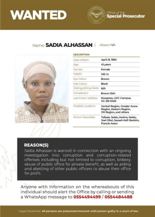 Alhassan is wanted for her involvement in corruption, bribery, abuse of public office for private benefit, and aiding and abetting other public officers to abuse their office for profit.