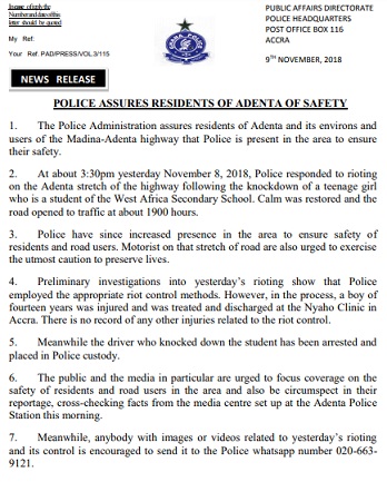 The Police in a seven-point statement assuring residents of Adenta of safety said the driver who