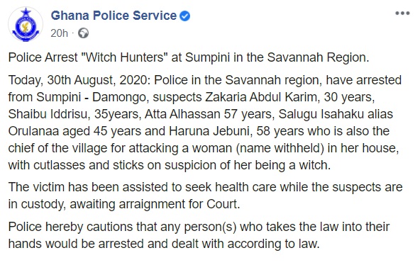 The Ghana Police Service has arrested five persons including the chief of Sumpini, Haruna Jebuni for their roles in the attack of a 50-year old woman accused of witchcraft in the Savannah region.
