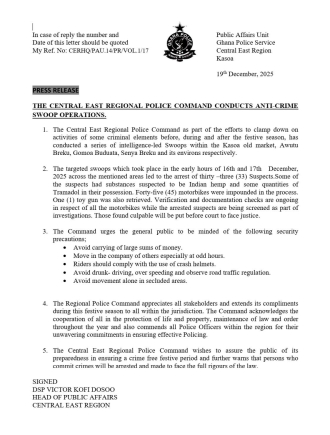 The Central East Regional Police Command has conducted a series of intelligence-led anti-crime swoop operations across parts of the region as part of efforts to curb criminal activities before, during and after the festive season.